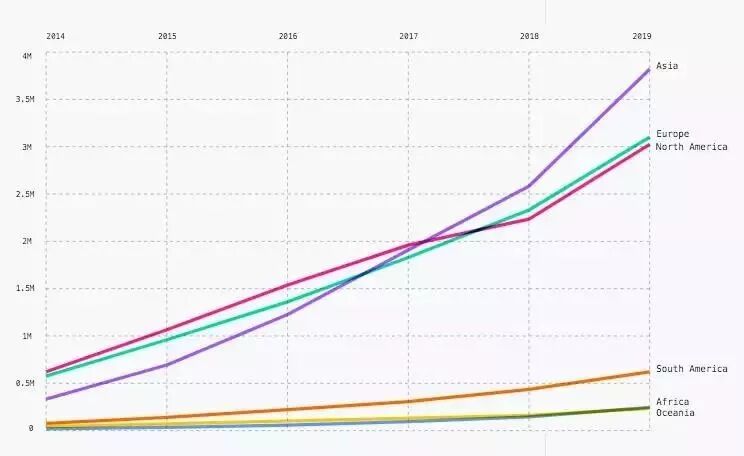 开源项目贡献者数量增长最多的是中国香港。除开源之外,从公共和私人贡献来看,亚洲的开发者社区在2019年增长迅速。其中31%的亚洲贡献者来自中国。自2014年以来,美国以外地区开发者数量不断上升,亚洲贡献者群体的年增长率已超过欧洲和北美。